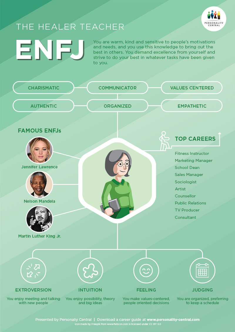 ENFJ는 재치 있으며 사교적이어서 다른 사람들을 아늑하게 해주고, 다른 사람들을 다치게 하지 않기 위해 무엇이든 즐거이 하고요. 그렇지만 남을 흐뭇하게 하기 위함으로 자신이 해결할기 힘든 일을 걸머지는 분위기이 있습니다.