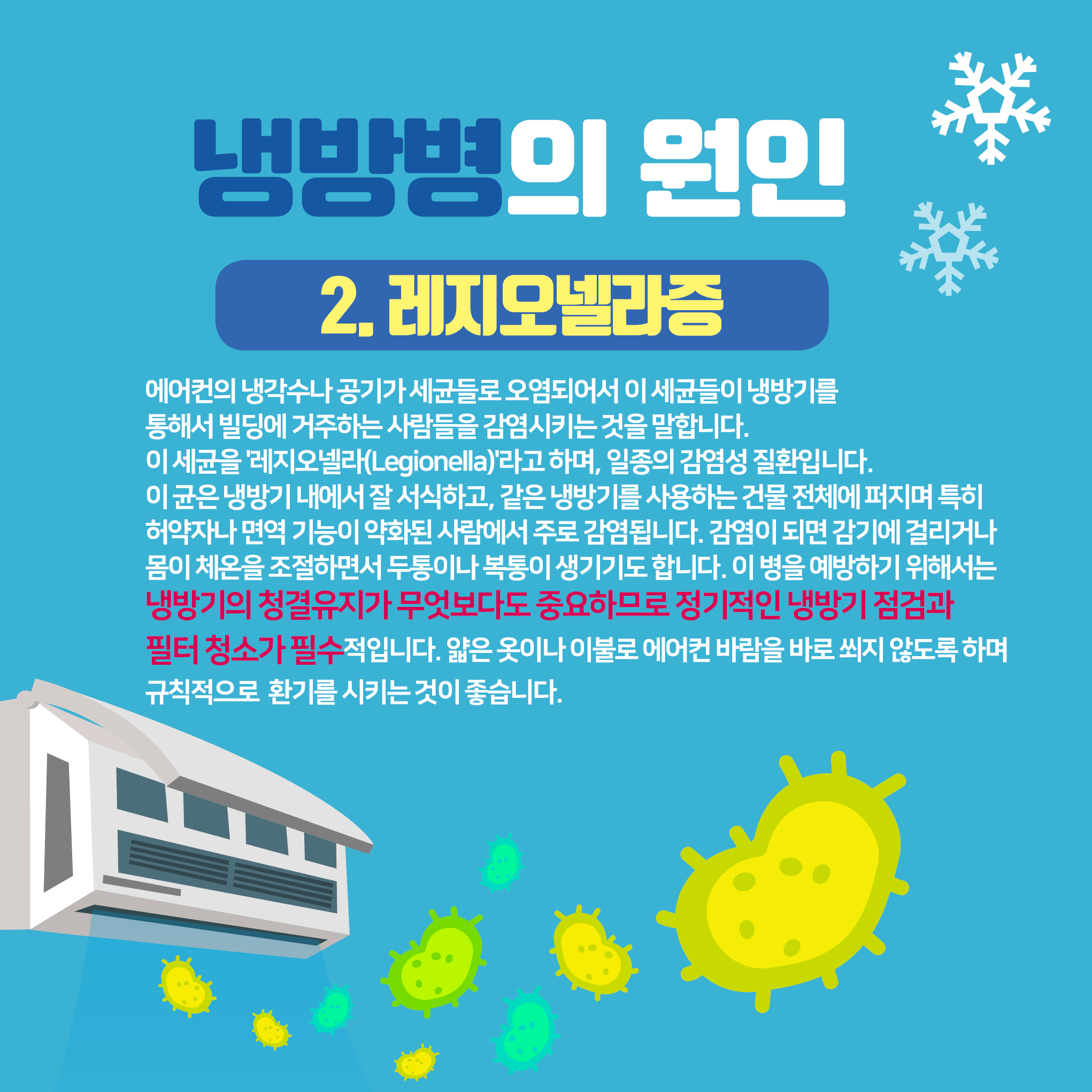 에어컨의 오염으로 인한 세균의 감염에 의해 발생하는 질환으로 주로 에어컨에서 잘 번식하는 레지올레나균의 감염으로 말미암아 일어나는경우가 가득합니다. 상식적인 냉방병 증상과 아울러 두통, 피로감, 구토, 설사, 위장장애 등의 증상이 나타날수 있습니다.