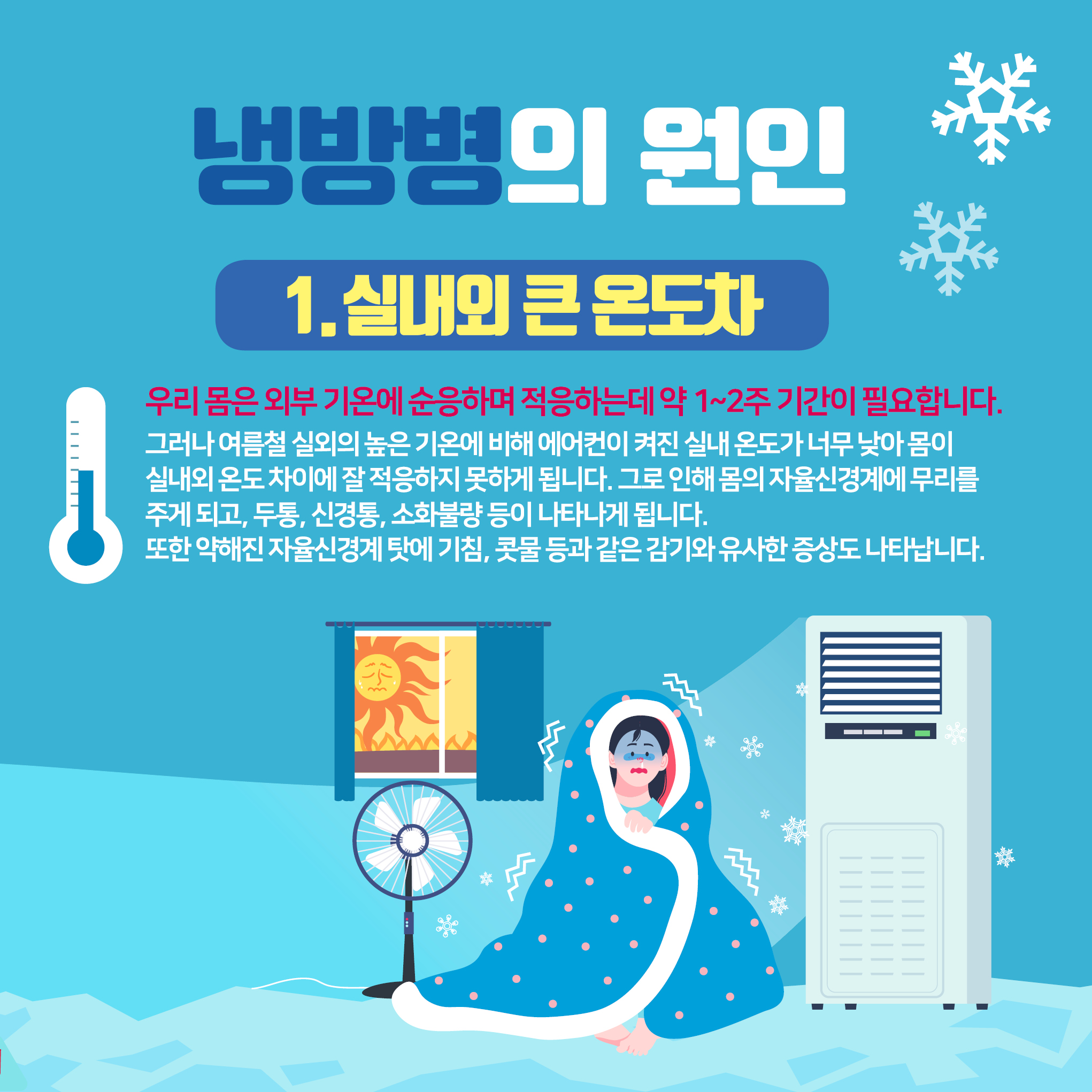 냉방병은 무엇보다 예방이 제일 중요하죠. 우선 너무한 냉방을 자제하고, 과로를 하지 않는 등 몸의 면역력 유지에 잘살펴야 하고요. 그리고 몸 내부에 한기를 느낄 때에는 긴소매 남방이나 카디건을 준비해 두었다가 걸쳐 입고, 따뜻한 차를 걸핏하면 마시어 몸을 따끈하게 계속 이어가요.
